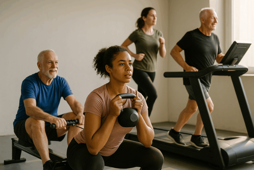 La force décline naturellement avec les années si on la laisse faire : autour de 1–1,5 % par an à partir de la cinquantaine, puis plus vite après 70 ans (17,18). Ce n’est pas une malédiction, c’est une trajectoire par défaut. Deux séances de renforcement intelligemment menées chaque semaine peuvent inverser cette pente, même si l’on démarre tard. La progressivité, la technique et la constance priment sur la performance. Les charges doivent être « suffisantes », c’est‑à‑dire assez lourdes pour que la dernière répétition d’une série propre soit difficile. Les exercices polyarticulaires (squats, fentes, tirages, poussées, soulevés de charge) sont des alliés majeurs. Pour l’endurance, nul besoin de marathon : 30–45 minutes de vélo, rameur, marche en côte, natation ou course lente, où l’on peut parler sans être essoufflé mais pas chanter, suffisent à faire monter les mitochondries au front (9,19). Ajoutez ici ou là un « sprinkle » de haute intensité (quelques montées de genoux explosives, des sprints courts, une montée d’escaliers à fond) et vous avez une recette efficace, gratuite et profondément physiologique (8).