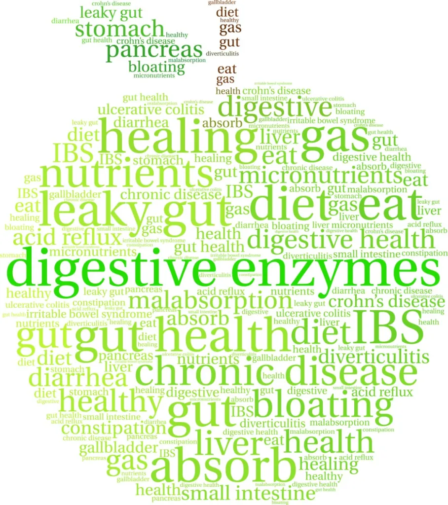 D’autre part, lorsque l’intestin est enflammé ou le siège de fermentations bactériennes comme dans la candidose ou le SIBO ou d’autres infections digestives, les enzymes de la bordure en brosse de l’intestin sont en partie détruits. Ce sont ces enzymes lors des dernières phases de digestion qui permettent l’absorption des nutriments et donc la personne qui souffre de problèmes intestinaux chroniques n’aura pas une bordure en brosse qui fonctionnera de façon optimale. Dans ce cas la personne pourra prendre les meilleurs aliments ou les meilleurs suppléments mais si elle n’a pas les enzymes pour réellement extraire et décomposer les micronutriments des aliments ingérés, on pourra assister à une baisse du niveau d’énergie et une augmentation de la nourriture pour les bactéries, ce qui va favoriser des fermentations avec des ballonnements, des problèmes digestifs et des problèmes immunitaires souvent autour d’un intestin poreux. Une étude récente, chez des enfants souffrant de dermatite atopique et d’allergies alimentaires, a montré que la prise d’enzymes digestifs était associée à une amélioration de la perméabilité intestinale s’accompagnant d’une amélioration des symptômes de la dermatite atopique et des allergies alimentaires (7).