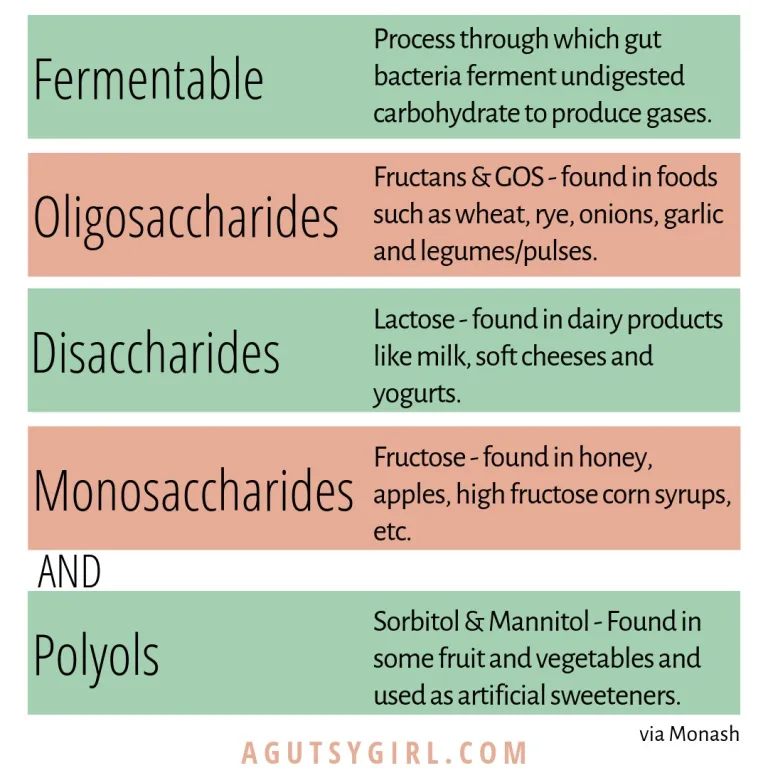 Dans le régime pauvre en fodmaps, on va réduire ou éliminer 4 catégories de glucides fermentescibles, à savoir les oligosaccharides, les disaccharides (lactose), les monosaccharides (fructose) et les polyols. Cette diète a été étudiée et élaborée pour le côlon irritable par la Monash University en Australie. Il faut donc souligner le fait qu’il ne s’agit pas d’une diète étudiée spécifiquement pour le SIBO. Le terme FODMAP est un acronyme qui informe des glucides à éviter :