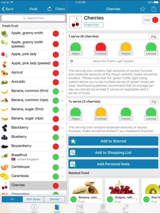 Il existe de nombreuses listes sur Internet ainsi que de nombreux ouvrages traitant de cette diète. On trouve également des applications pouvant être téléchargées sur son téléphone portable, la plus complète est celle de la Monash University. Il ne s’agit pas d’éliminer complètement des aliments considérés comme fermentescibles mais de tenir compte également des quantités permises. C’est pourquoi, sur ces applications, on retrouve les quantités de portion de nourriture calculées sur une échelle de fermentibilité des aliments (faible, modéré et élevé) à travers une échelle de couleurs.