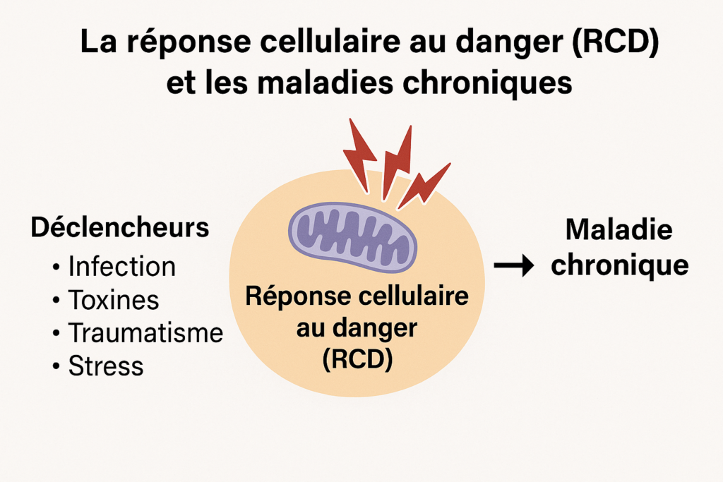 Tout commence par un déclencheur : une infection virale, une toxine environnementale, une blessure, un traumatisme psychique, un stress métabolique ou même une carence nutritionnelle aigue. Quel que soit le stimulus, la cellule détecte une altération de l’homéostasie, et c’est la mitochondrie sentinelle énergétique et environnementale, qui initie la cascade. En effet, la mitochondrie, détectant le danger, interrompt sa production normale d’ATP par phosphorylation oxydative. Elle induit un shunt vers la glycolyse anaérobie, plus rapide mais moins efficace. Le problème est que lorsque la menace est écartée, la cellule devrait recevoir des signaux clairs que le danger est écarté, ainsi elle pourrait relancer ces activités normales, réparer ce qui doit l’être, et retrouver sa place dans le tissu organique. Mais parfois, ce signal de paix n’arrive jamais. Le danger est dissipé mais la cellule n’est pas informée, les signaux de dangers persistent. C’est alors que le CDR, défensif au départ, devient pathologique. La cellule devient un acteur d’une pathologie chronique. Et c’est là que la médecine classique, focalisée sur la cause initiale, perd ses repères. Car une fois que l’infection est terminée, la toxine excrétée ou la blessure guérie, il ne reste que des symptômes persistants sans cause identifiable. Le patient est fatigué, douloureux, déréglé mais les analyses sont normales. Ce modèle CDR permet ainsi de réconcilier une multitude de pathologies sous un même paradigme : le blocage d’un processus adaptatif nécessaire, mais non résolu. Il introduit une médecine du « temps cellulaire », où l’urgence est de restaurer non pas ce qui est perdu, mais ce qui n’a jamais été pleinement accompli : la sortie de l’alerte.