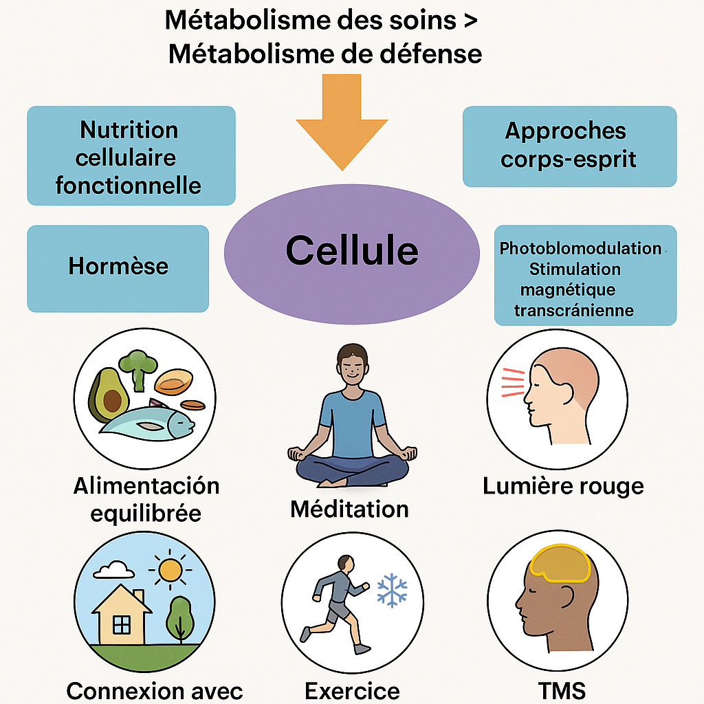 Si la pathogénèse vise à supprimer l’agression, l’approche de Naviaux vise à restaurer les conditions de guérison. C’est une médecine de la reconstruction du signal de paix, de la relance énergétique et de la communication cellulaire retrouvée. Dans ce paradigme, les stratégies thérapeutiques deviennent multiples, combinatoires, souvent non pharmacologiques et doivent s’adapter au terrain autant qu’aux symptômes. Il ne s’agit pas de cibler une molécule mais de remettre en route une dynamique physiologique.