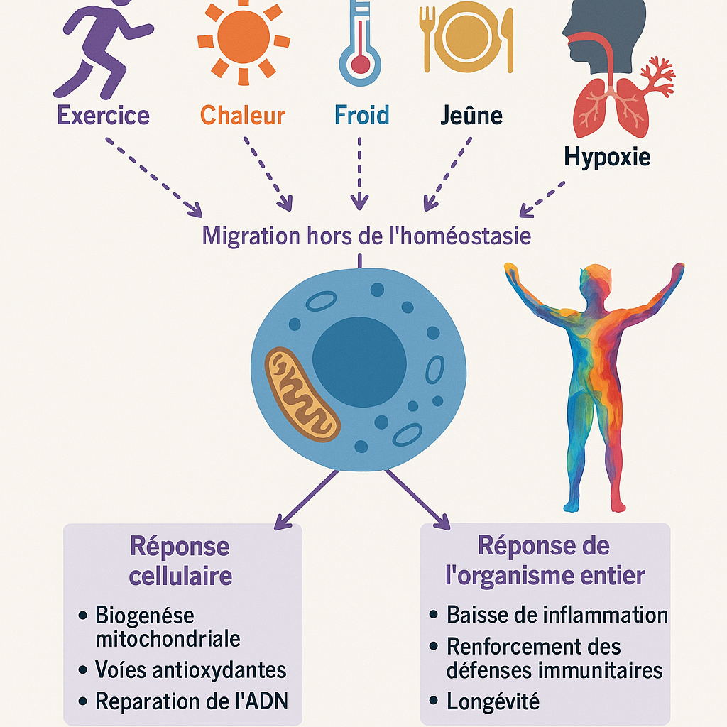 Ces interventions créent des écarts temporaires à l’homéostasie, suffisamment brefs pour éviter la surcharge mais assez intenses pour activer les voies de signalisation cellulaire qui préparent à la résilience. Les mitochondries jouent ici un rôle clé : ce sont elles qui enclenchent des programmes de protection adaptative (via Nrf2, FOXO ; PGC1-alpha). L’hormèse bien conçue, peut ainsi devenir un signal de relance de la guérison cellulaire, une manière de dire à la cellule : « tu peux recommencer à vivre, car tu es assez forte pour t’adapter ». C’est une médecine de l’encouragement biologique, de la petite mise à l’épreuve qui réanime.