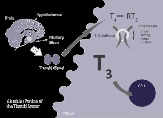 Dans ce cas de figure, on peut avoir une TSH et une T4 dans la norme avec une T3 basse associées à des signes cliniques et des symptômes d’hypothyroïdie. De nombreux facteurs peuvent perturber la fonction de l’enzyme 5 déiodinase, voici peut-être les causes principales :