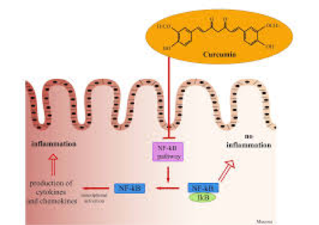 La curcumine a montré dans de nombreuses études son rôle anti-inflammatoire et modulateur de l’immunité en agissant sur les cytokines inflammatoires et l’expression du NF kappa b. Par son effet anti-inflammatoire, la curcumine représente une alternative cohérente dans la prise en charge des maladies inflammatoires de l’intestin. La curcumine a montré un effet protecteur et anti-inflammatoire sur des modèles animaux (25). Deux études randomisées ont montré un effet positif dans la colite ulcéreuse. Ainsi, dans un essai comprenant 50 patients avec une forme active, ceci malgré la prise de Pentasa à dose maximum, l’adjonction de 3 gr de curcumine par jour a permis une réponse clinique favorable et un taux de rémission supérieur que le groupe placébo (26). Bien entendu, des études avec des populations plus importantes sont nécessaires pour confirmer ces résultats. En attendant, la prescription de curcumine peut être proposée de façon raisonnable dans la prise en charge des MICI.