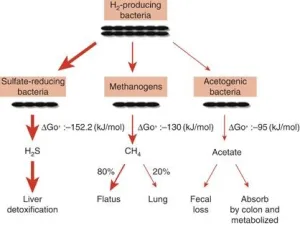 Diverses bactéries intestinales ont la capacité de produire de l’hydrogène sulfureux. La voie de production la plus classique implique les bactéries sulfato-réductases dont les espèces les plus connues sont le Désulfovibrio et la Biophila (transformation du sulfate en sulfite, puis en H2S). D’autres espèces de bactéries peuvent utiliser une voie non prépondérante pour produire de l’H2S telles que certains streptocoques, le fusobacterium, des salmonelles, certains enterobacters, l’helicobacter, etc. Ces bactéries peuvent produire de l’H2S depuis la L cysteine par l’activité de la cysteine desulfhydrase.