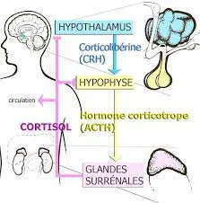 L’hypothalamus reçoit l’information provenant des centres du danger que sont l’amygdale et l’hippocampe. L’hypothalamus libère 2 hormones la CRH et la vasopressine qui stimulent la sécrétion de l’ACTH par l’hypophyse. L’ACTH agit à son tour sur les cellules du cortex surrénalien pour synthétiser du cortisol et nous verrons l’importance clé de cette hormone de stress sur notre corps.