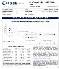 Ce test uniquement le matin permet d’apprécier la réactivité principale au stress en appréciant l’importance du CAR. Il faut collecter un échantillon au levé (dans les 5 minutes), puis à 30 min, 45 min et à 1 heure après le levé. Lors de ce test vous n’avez pas de référence de laboratoire. Il faut juste regarder d’avoir une augmentation de 35 à 60% par rapport à la baseline dans les premières 30 à 45 min.