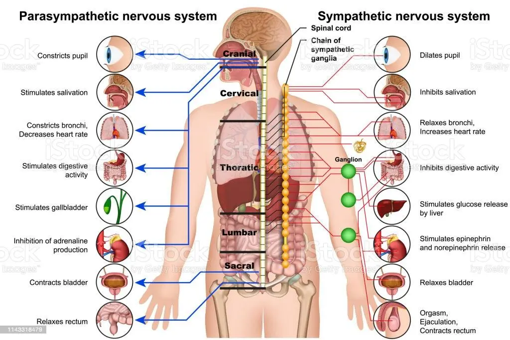 Nous voyons dans le schéma ci-dessous l’influence de ces deux systèmes sur de nombreuses fonctions physiologiques.
